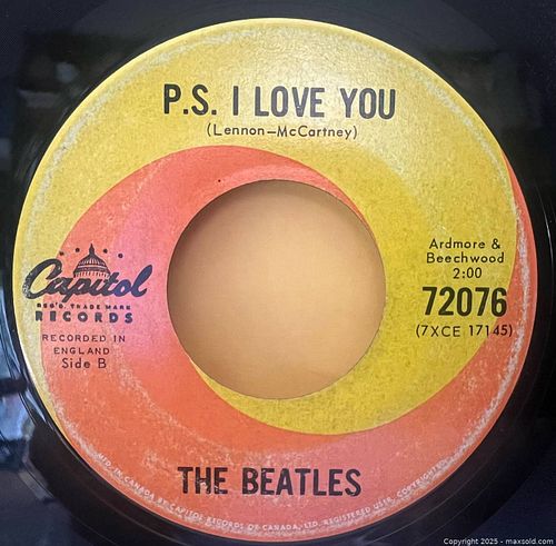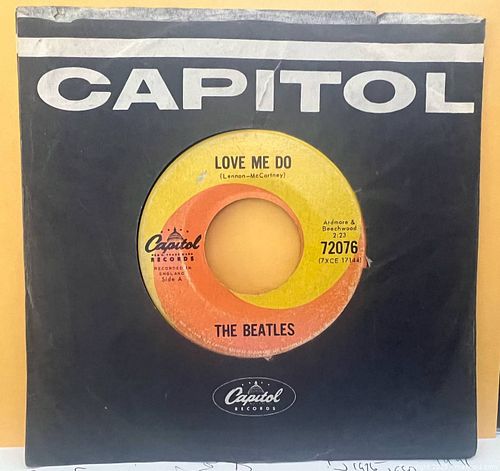 The Beatles "Love Me Do" Capitol Records Canada - 1st North American record to feature The Beatles by name. Issued in Canada February 1963 just weeks before the U.S.A. Vee Jay Records releases. Extremely rare only a handful known to exist. These first Capitol Canada pressings are identified by the large hand etched matrix numbers in the runoff grooves with no suffixes or extensions. 7XCE 17144 and 7XCE 17145. In addition, all February 1963 pressings have the "R" in Records (at the 9 o'clock label position) printed into the yellow portion of the label. Condition - Label - The labels have moderate wear with some rubs and marks and some paper loss on the A side. The vinyl has been played and has light surface marks on both sides. The record plays through with no skips but does have some surface noise and pops. Comes with an original Capitol Records black paper sleeve. Pickup category timeslot {B}